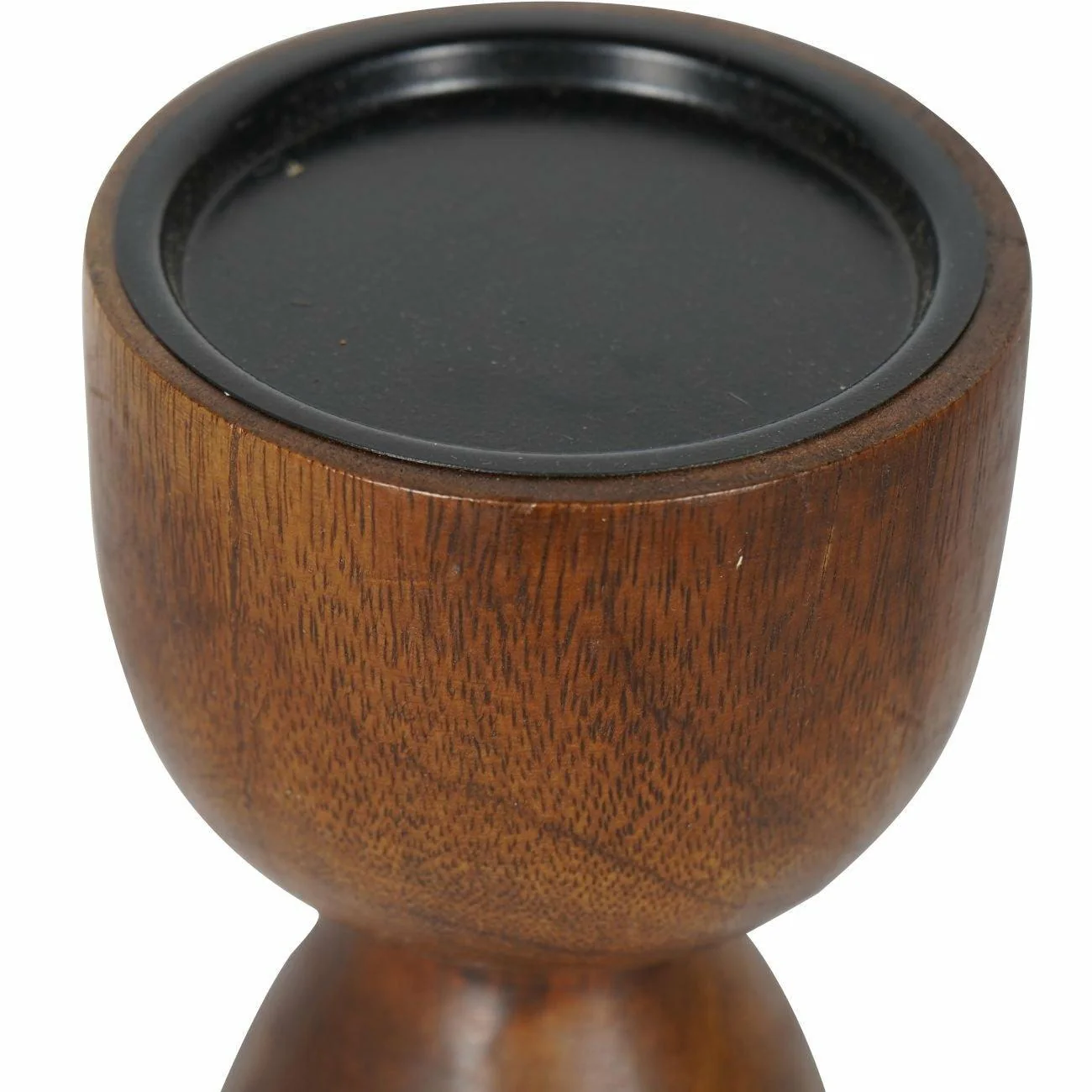 Our Small Bulbous Wooden Candle Holder stands 20cm tall and is made from natural wood, with a rustic deep brown finish.