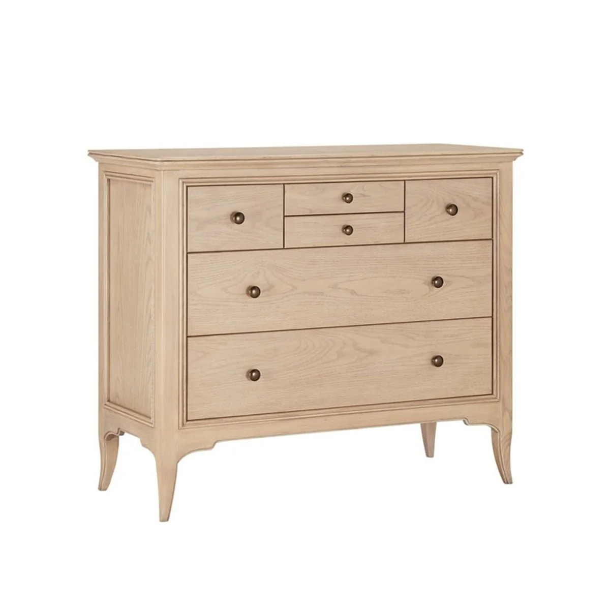 An elegant Oak French inspired wide chest of 6 drawers. With a bank of smaller drawers over 2 deeper ones, this is a classic chest of drawers. Inspired by classic French cabinetry, the Paris range is a beautifully re-imagined bedroom collection with understated feminine charm.