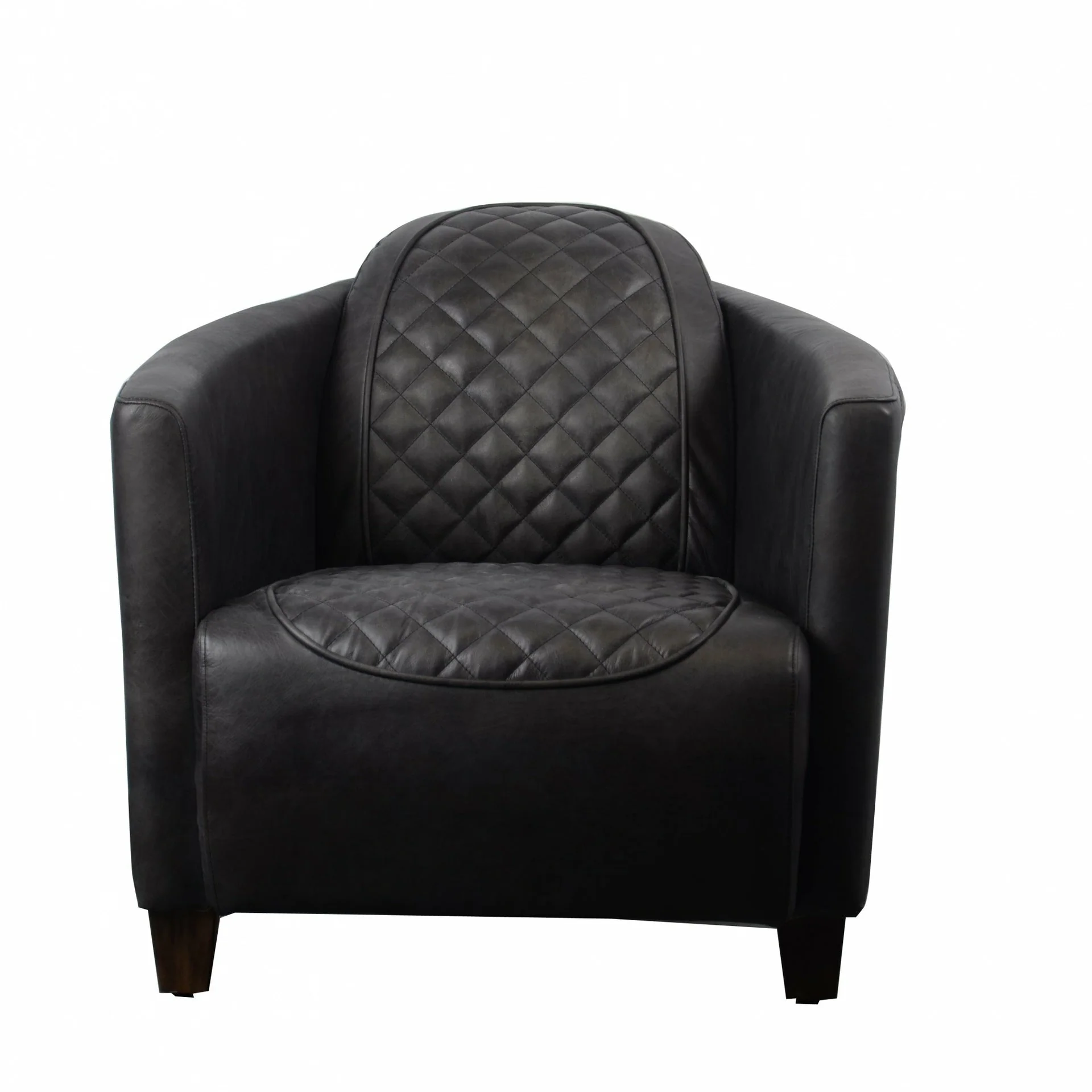 This vintage style low tub chair has a unique curved back with diamond stitching which makes it look as comfortable as it really is. It's distinctive style make this chair a great focal point in any room, either an easy chair to watch the TV or as a welcoming feature chair in a large entrance hall. This chair is as versatile as any setting and its quality speaks for itself. This chair is sure to become a favourite piece and the dark grey Aniline leather ensures it'll be durable enough for you to enjoy for many years to come.