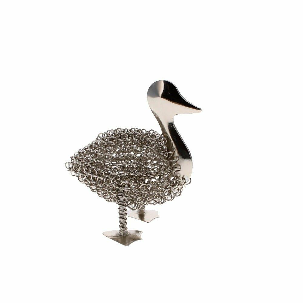 This duckling ornament is made from stretched and coiled wire, cross-wrapped around a frame and then nickel-plated.