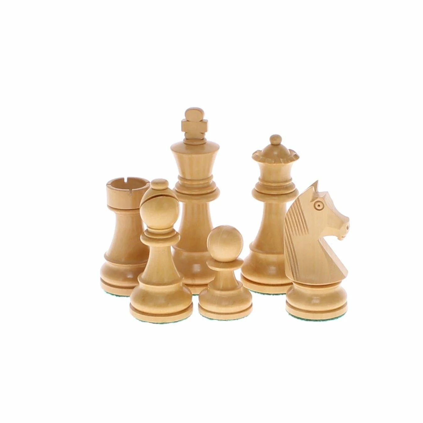 Board is solid wood 16" square (40cm) and 1" thick walnut and sycamore chess board and baize-based, hand crafted Staunton chess pieces.